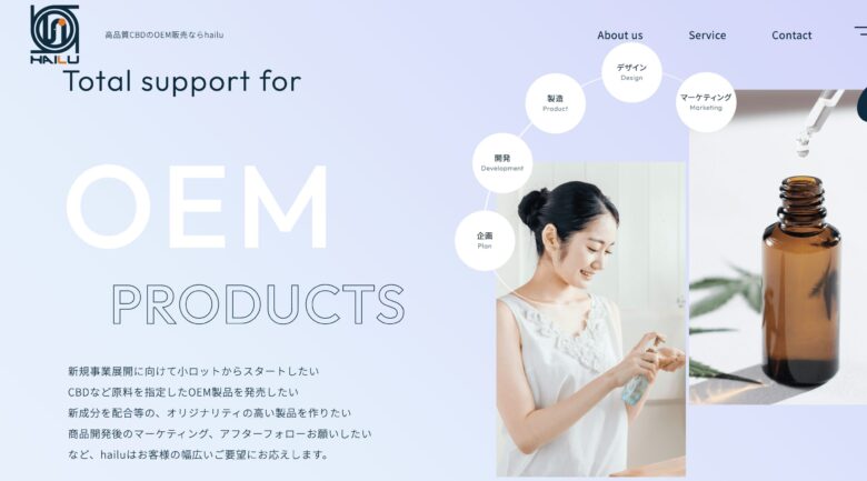 株式会社hailuは、厚生労働省が定める規格を満たした安心・安全なCBD原料を輸入・販売・OEMを受託製造するメーカーです。化粧品や健康食品、ペット用のサプリとしてCBD製品を企画・開発したい場合、頼りになります。CBD製品以外にも極小ロットでスキンケア、ヘアケアなどのOEMも手掛けており、在庫リスクを減らして新規事業を始めたい事業者の方におすすめのメーカーです。